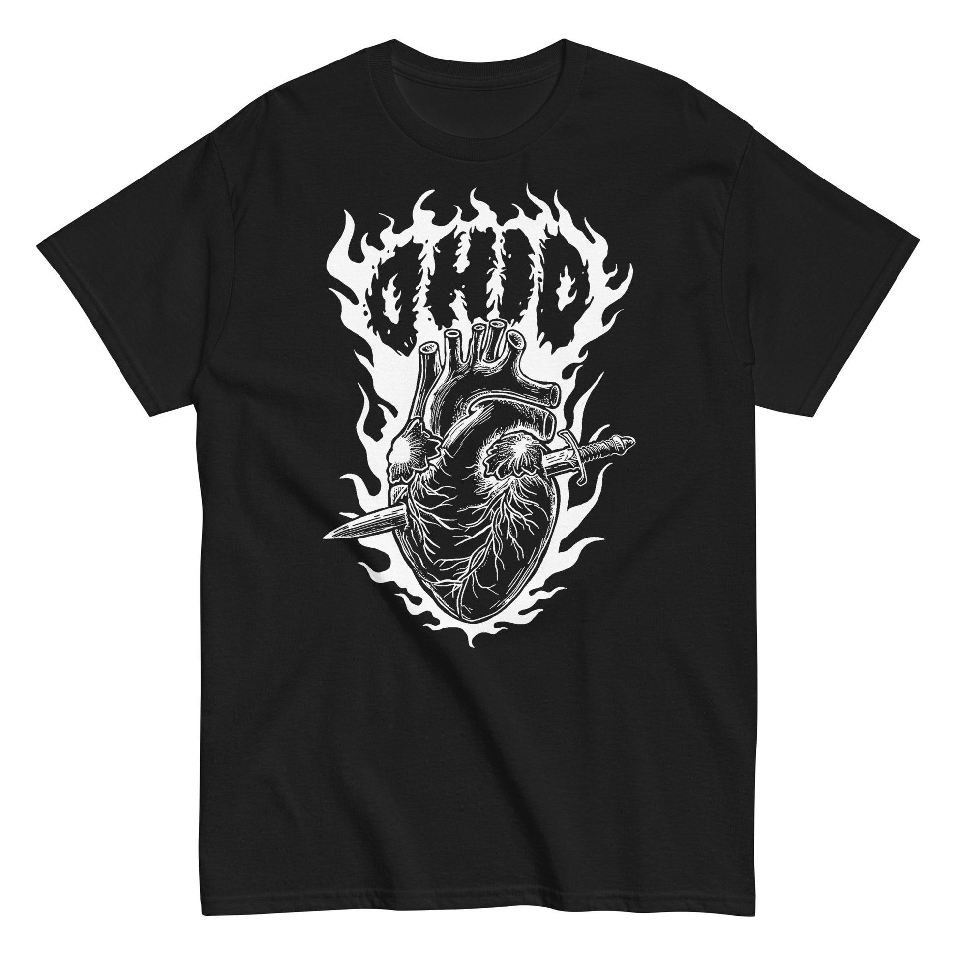 Shop our Ohio Death Metal Style Tee, featuring a blazing heart pierced by a dagger, with 'Ohio' engulfed in flames. This design captures the fiery spirit of the Buckeye State, known as the heartland and 'the heart of it all.'