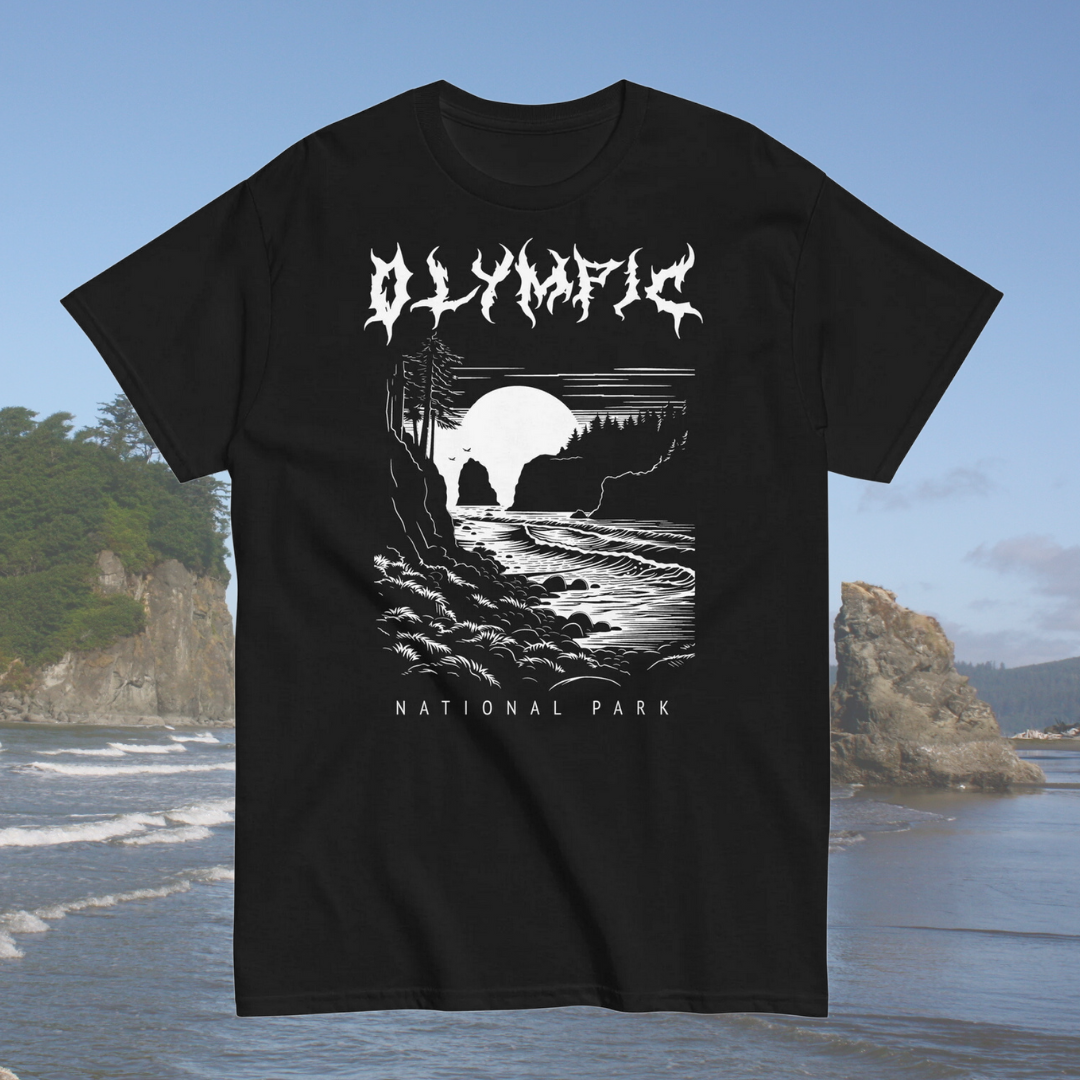 With three distinct ecosystems- subalpine forests, temperate rainforests, and rocky coastlines- covering nearly one million acres, Olympic National Park is one of Washington's favorite outdoor escapes. This death metal style tee features the beautiful vistas of the dramatic seascapes of the Pacific Ocean.