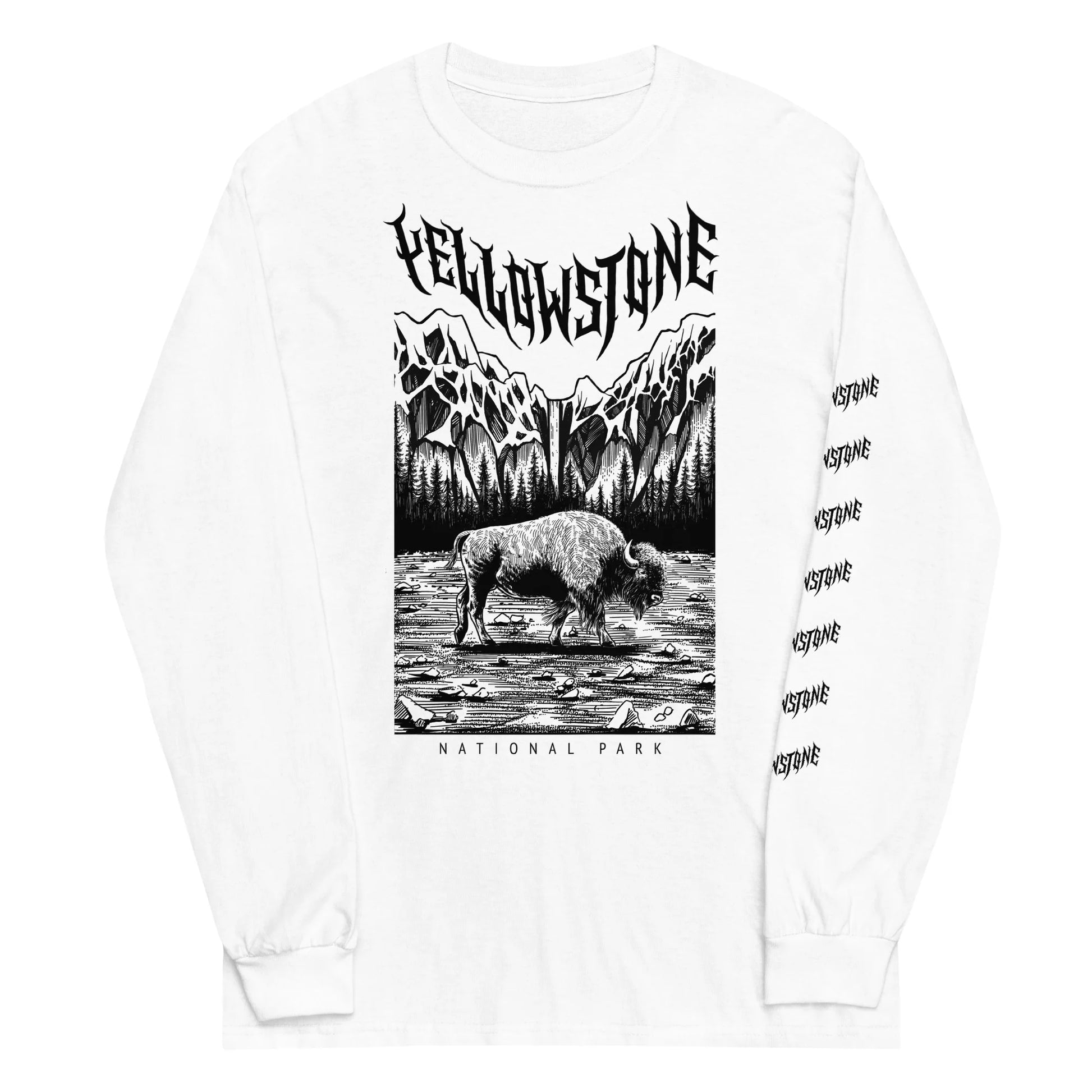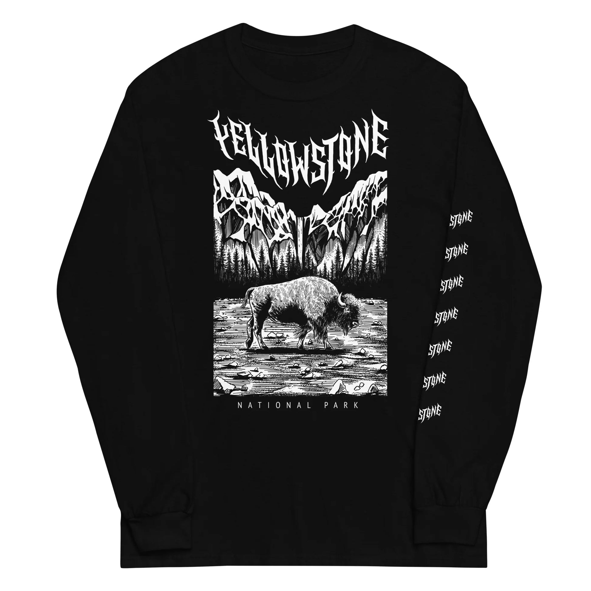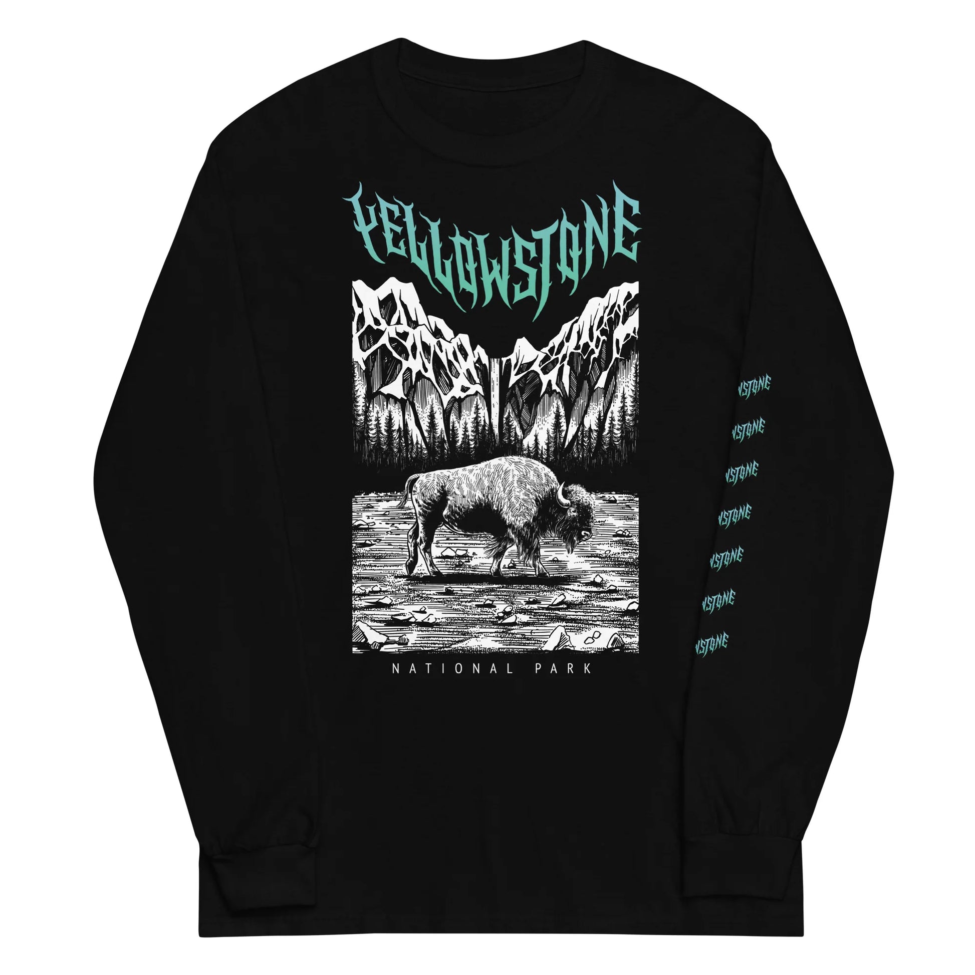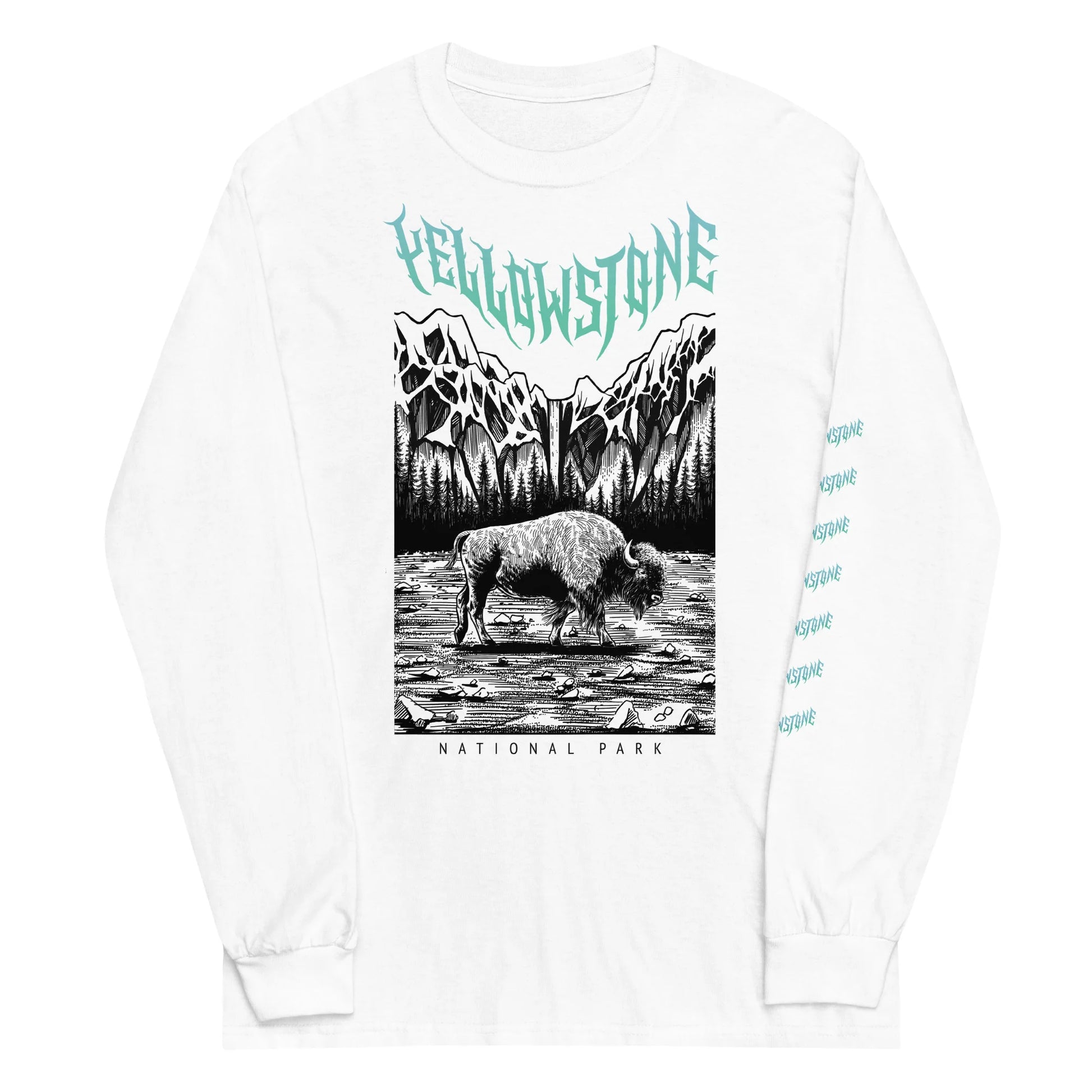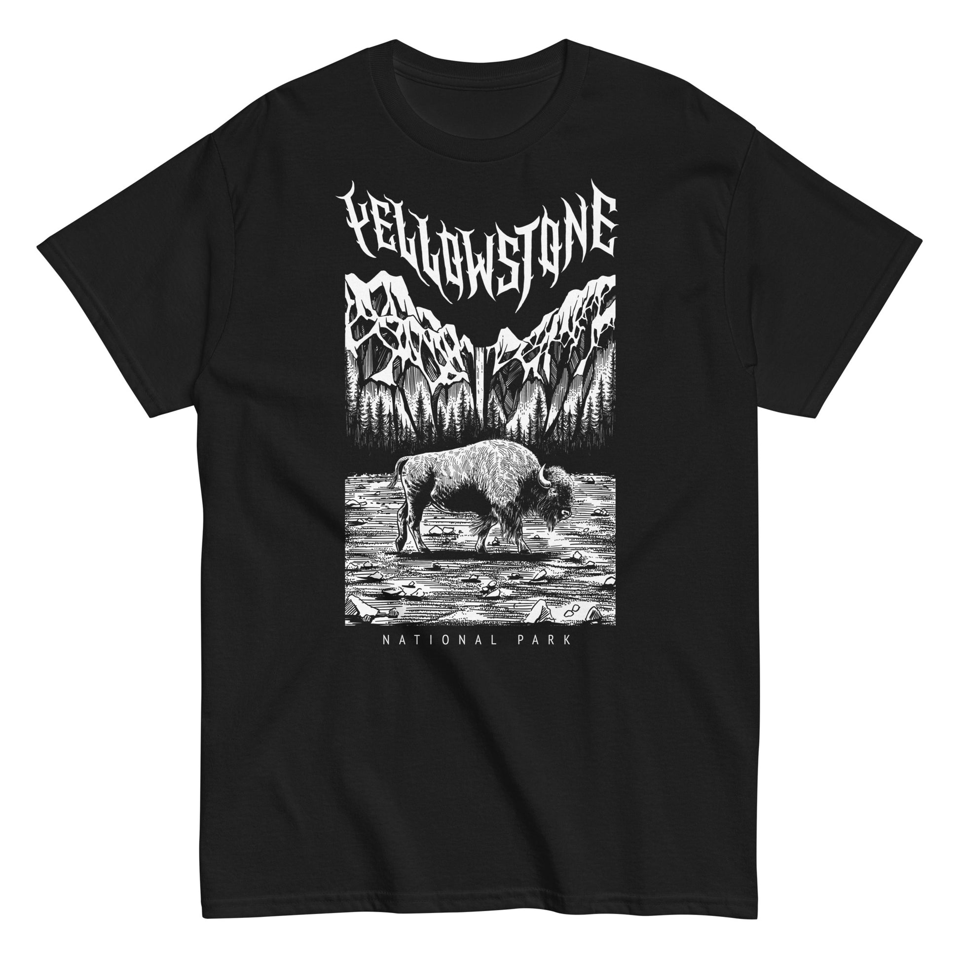 Today the park spans nearly 3,500 square miles of canyons, alpine forests, hot springs, and dramatic geysers. The park is also homes to hundreds of species of wildlife including one of the most iconic, and the one featured on this tee, bison.