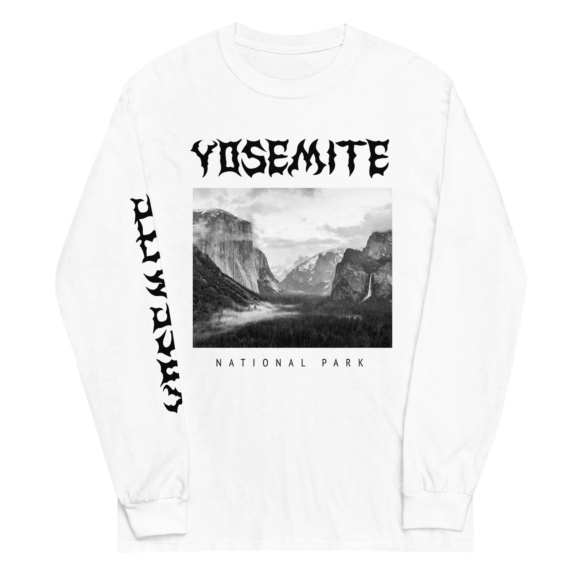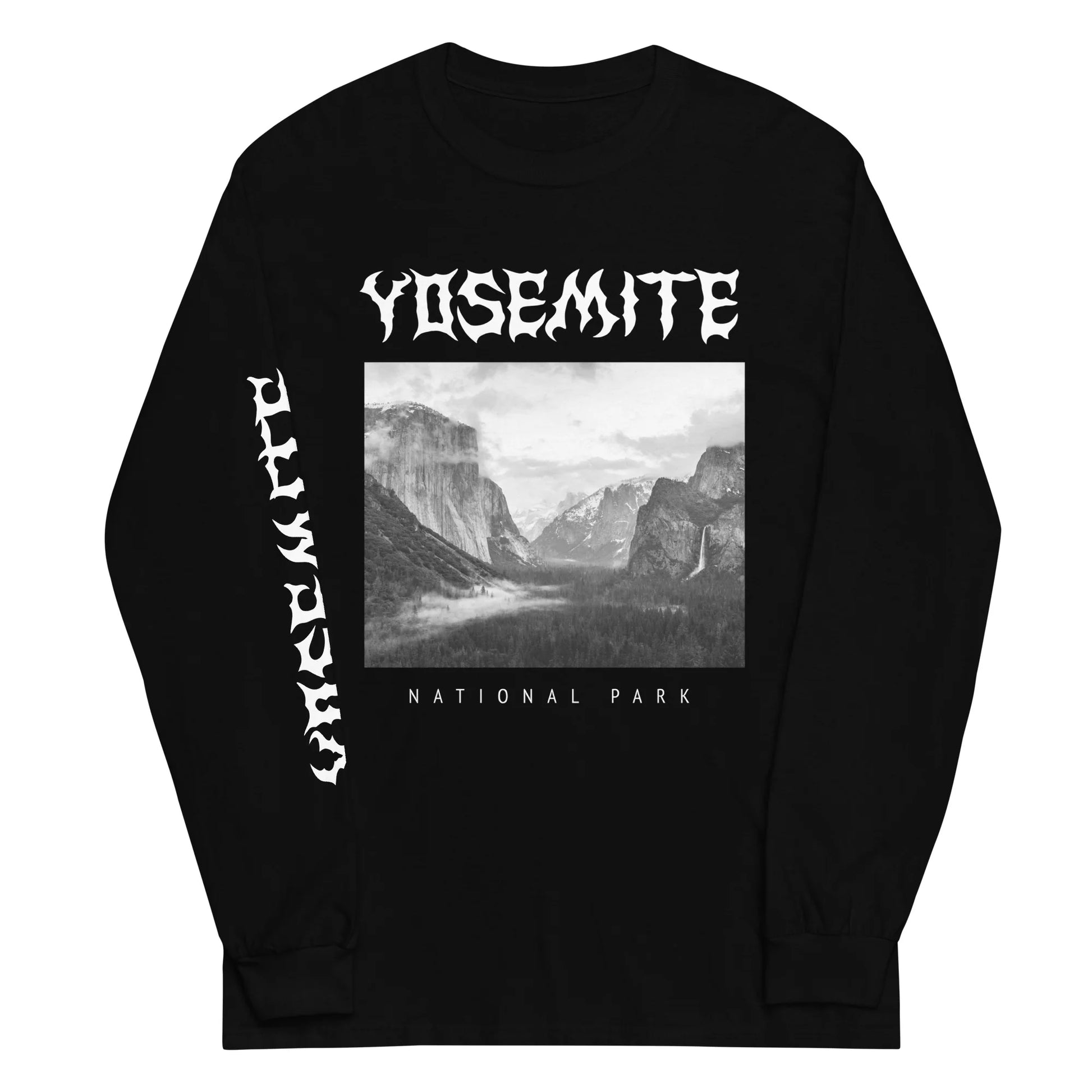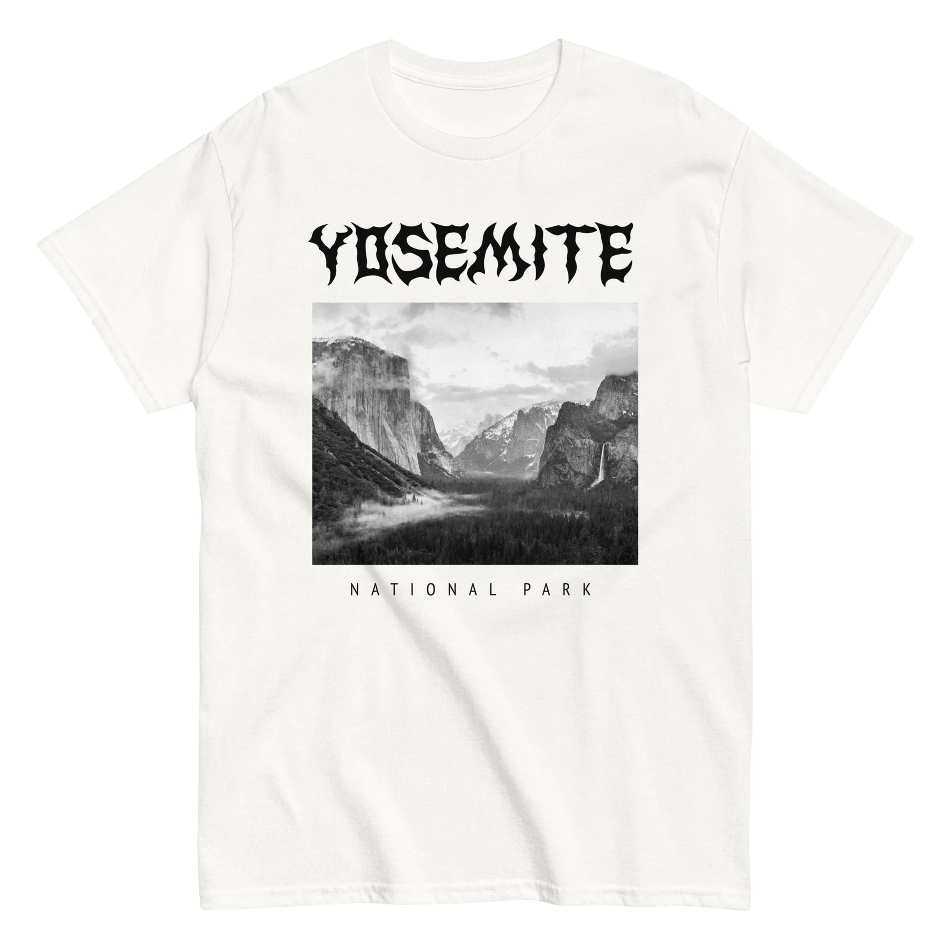 Experience the grandeur of Yosemite National Park with our death metal inspired tee. This wearable tribute showcases the park's iconic granite cliffs, including the renowned El Capitan, and Yosemite Falls from the 'Tunnel View'.